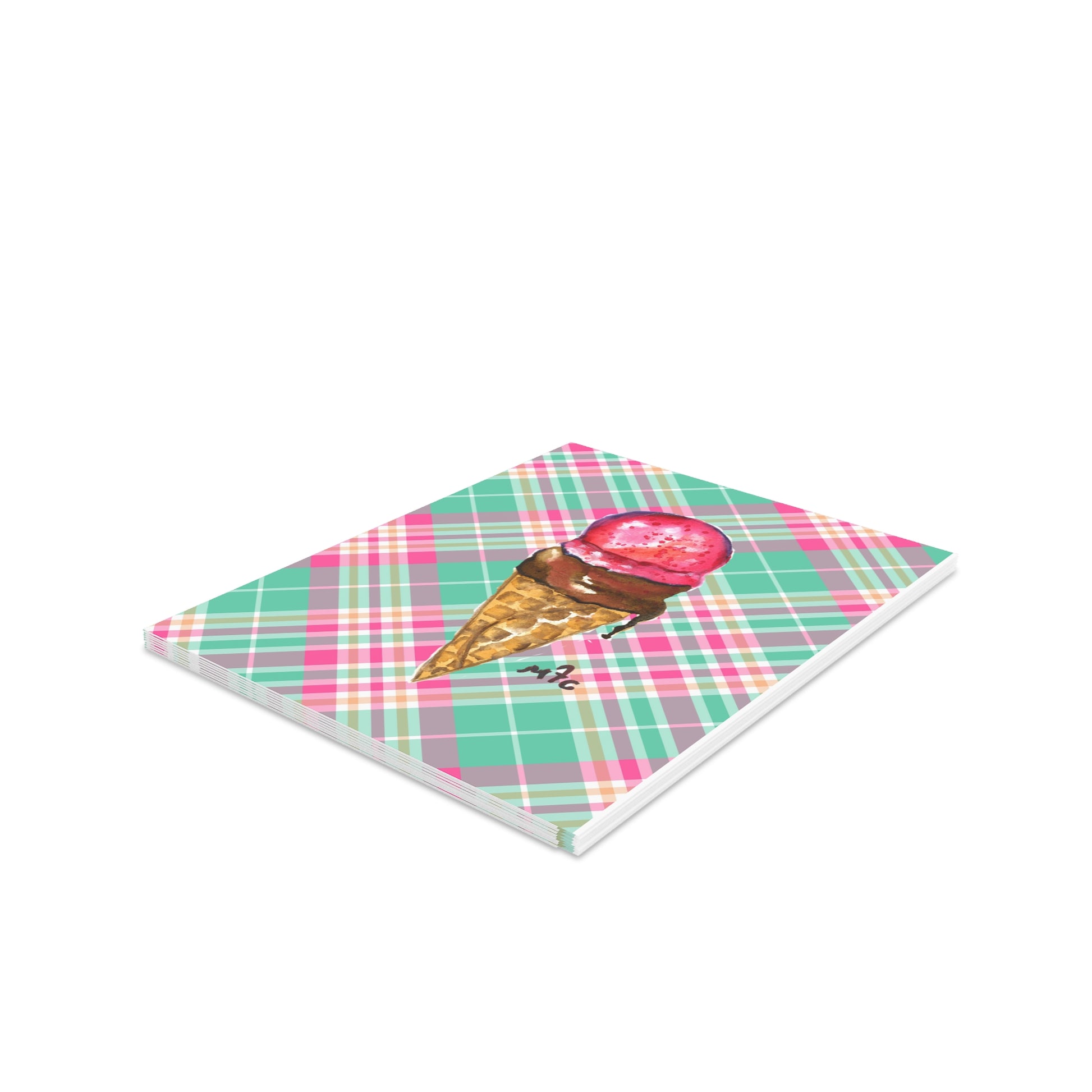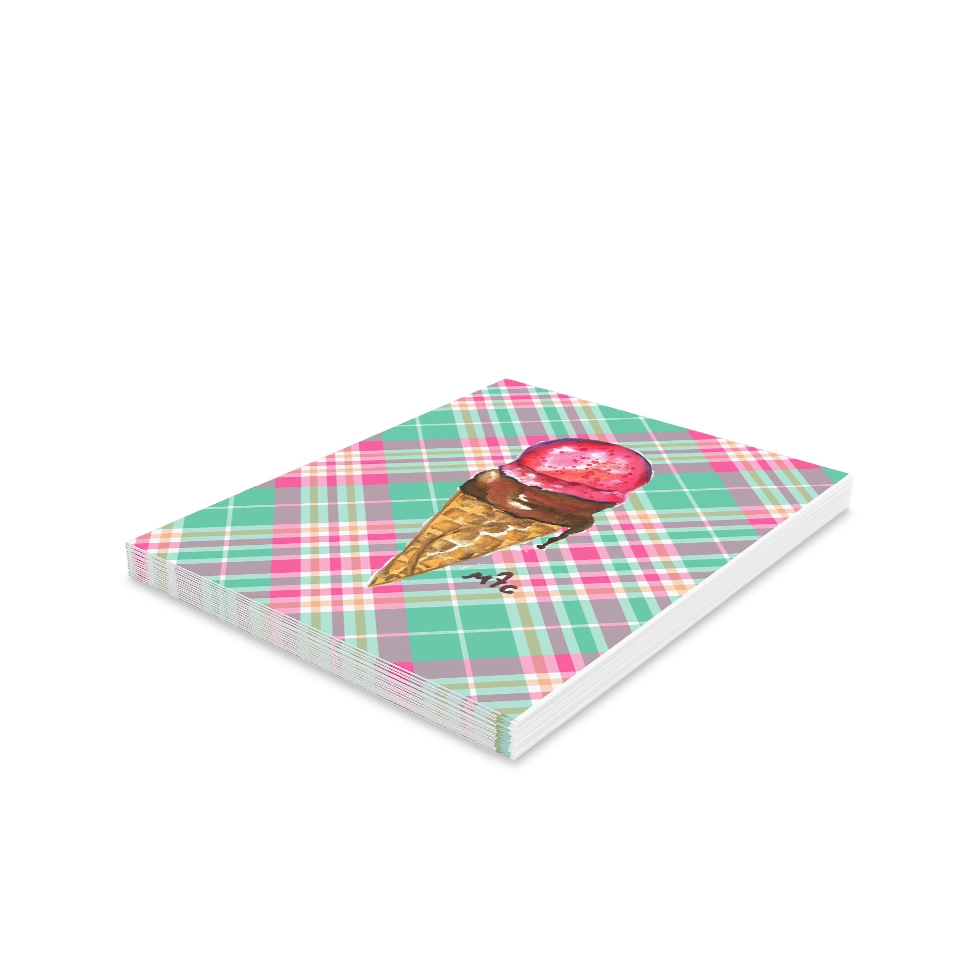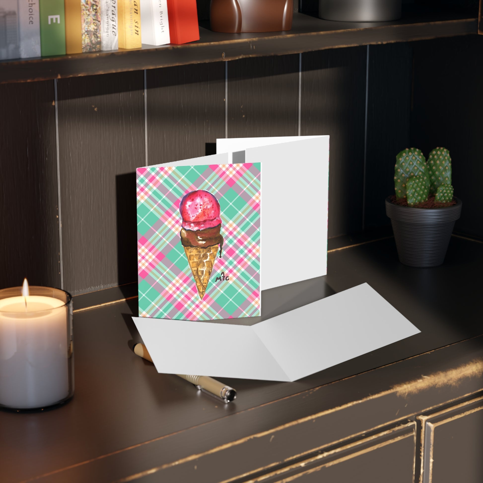 A playful set of matte greeting cards featuring a hand-painted ice cream cone over a cheerful pastel-plaid background. Each card prints in bright, crisp color on the front with the option to add custom text inside. The compact 4.25" x 5.5" size slips into a white envelope included with every card. These cards bring a lighthearted, sunny mood to notes, thank-yous, and small celebrations — a little scoop of joy for someone who loves whimsical, artful stationery.