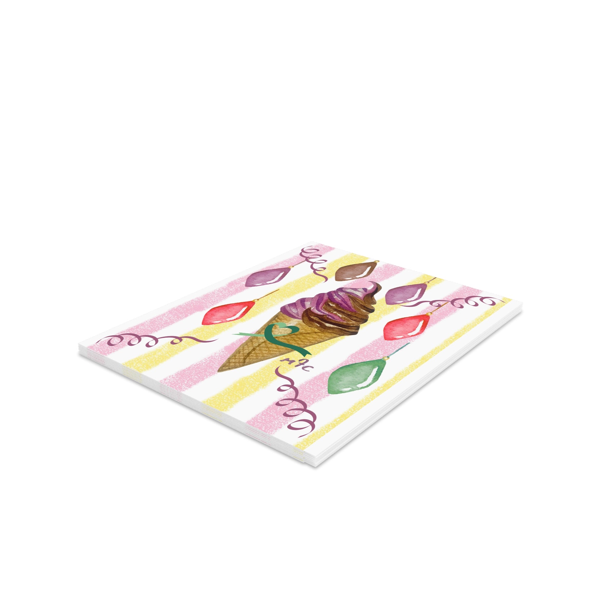 A small stack of joyful, artist-made greeting cards that feel like a handwritten hug. Each card features a whimsical watercolor illustration of a swirled ice cream cone framed by colorful ornaments and soft pastel stripes — playful, warm, and a little nostalgic. The matte finish gives the artwork a gentle, tactile look while the bright, modern printing keeps the colors lively and crisp. These 4.25" x 5.5" cards arrive with matching white envelopes and can be printed with your chosen message inside or left blank to write your own note. Slip one into a lunchbox, tuck it into a gift, or send it across town to brighten someone’s day.