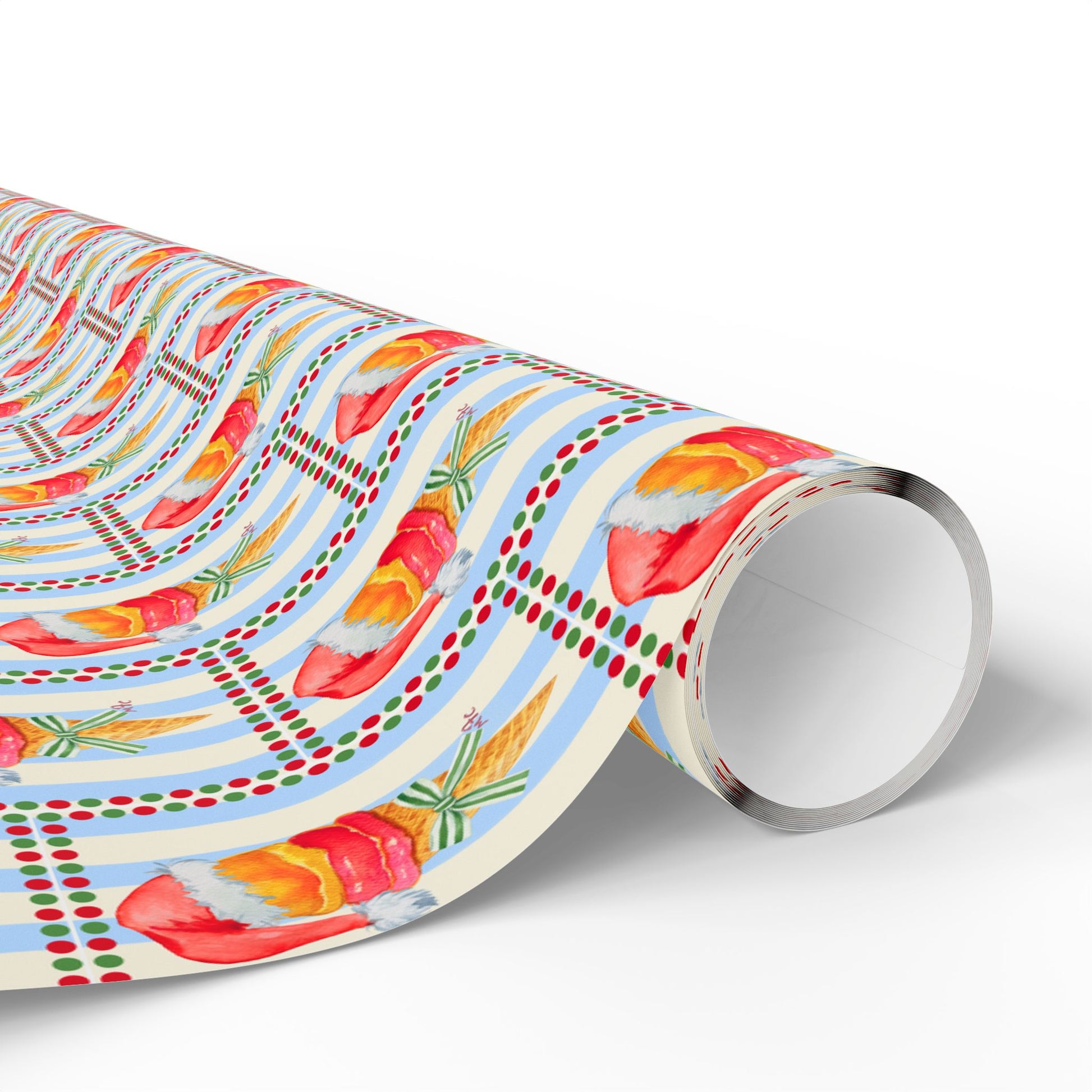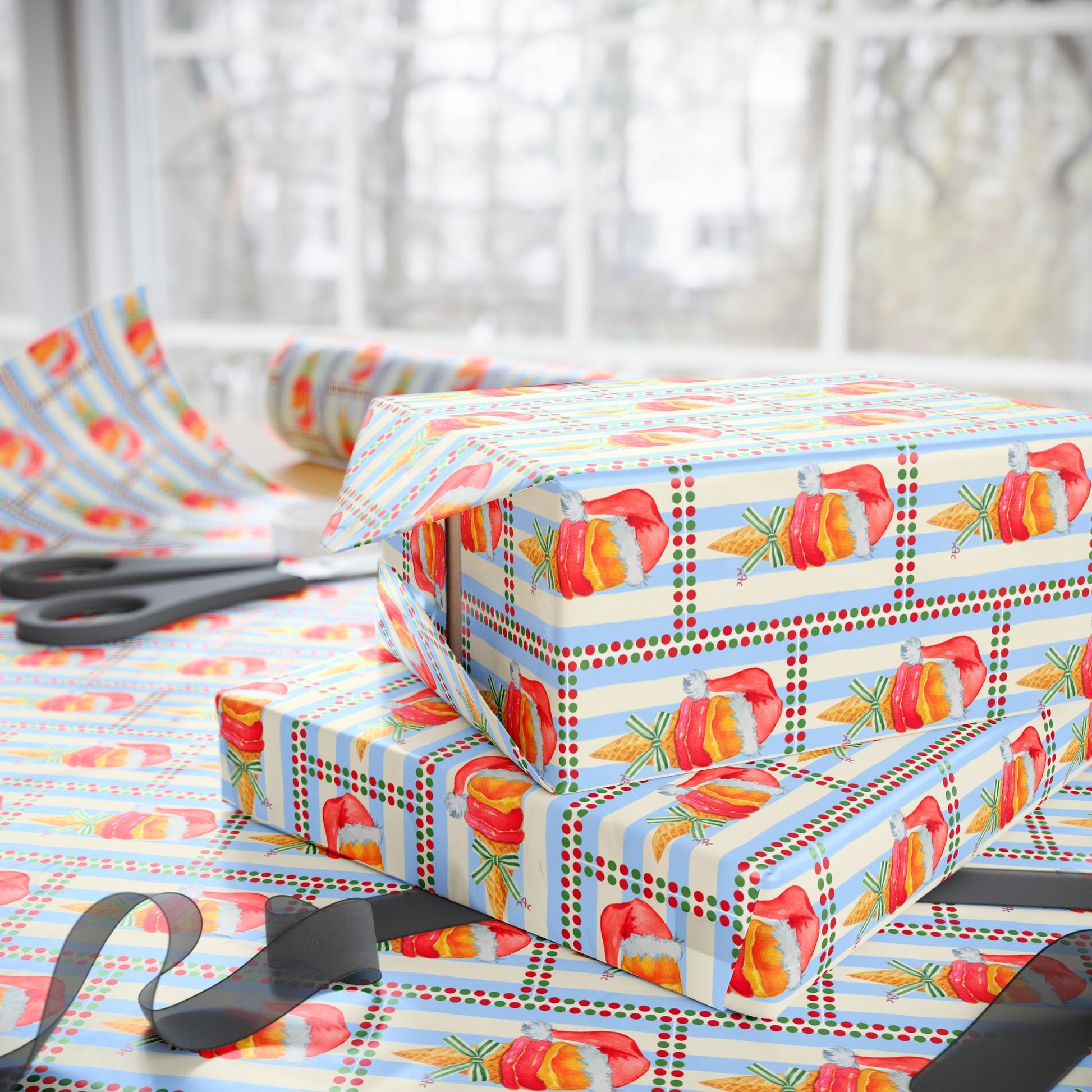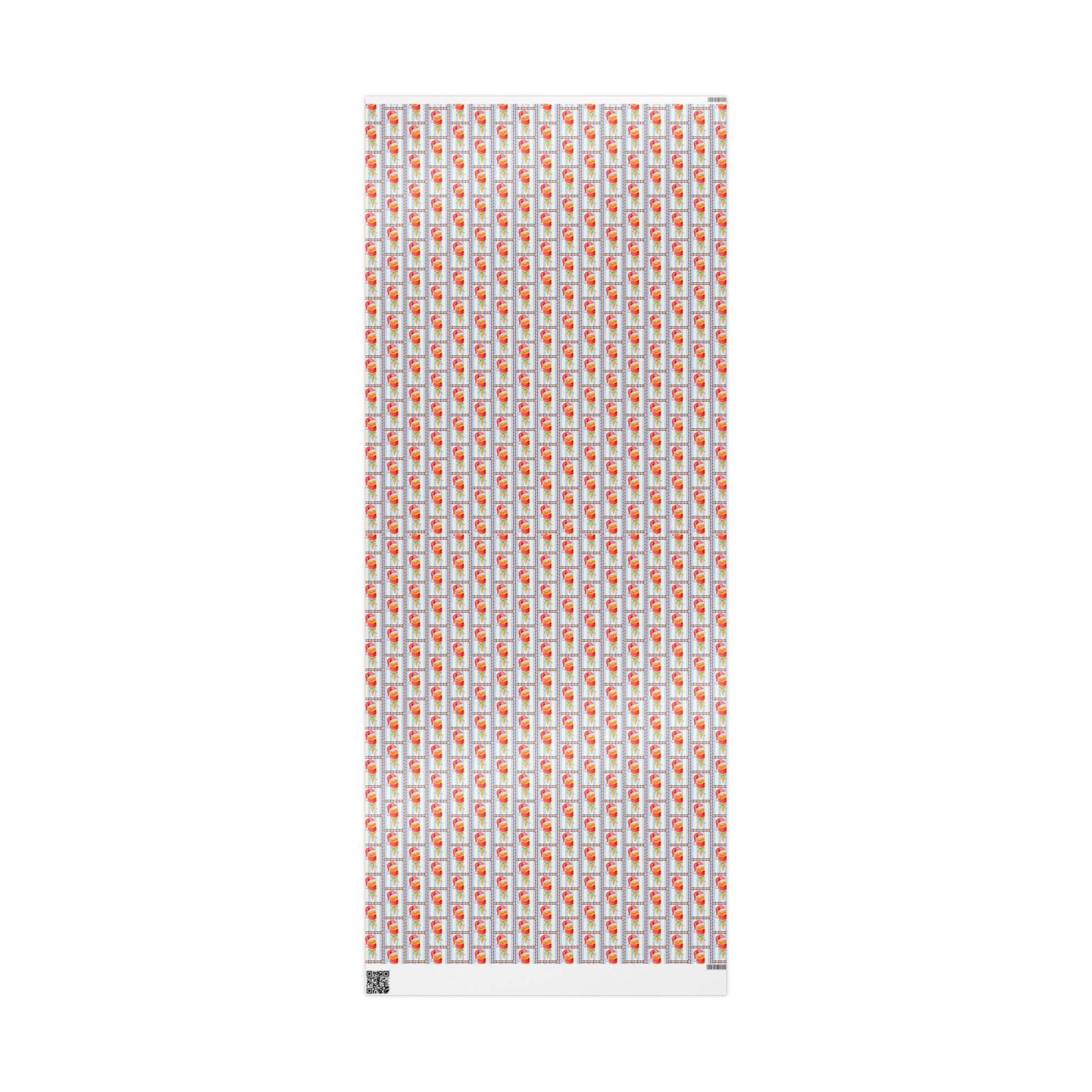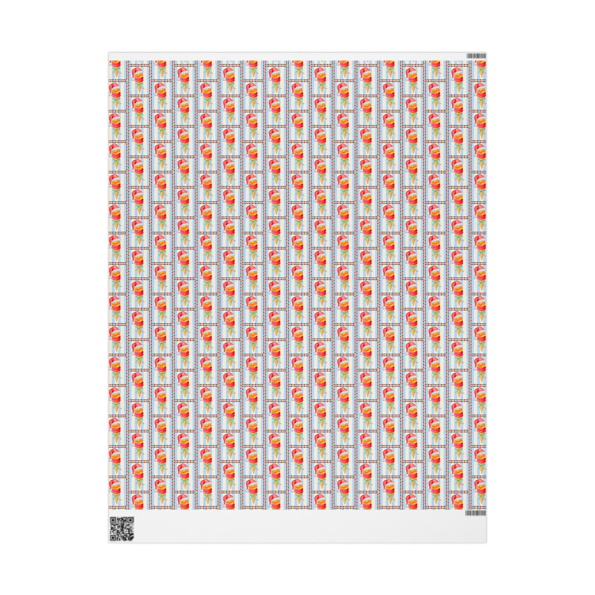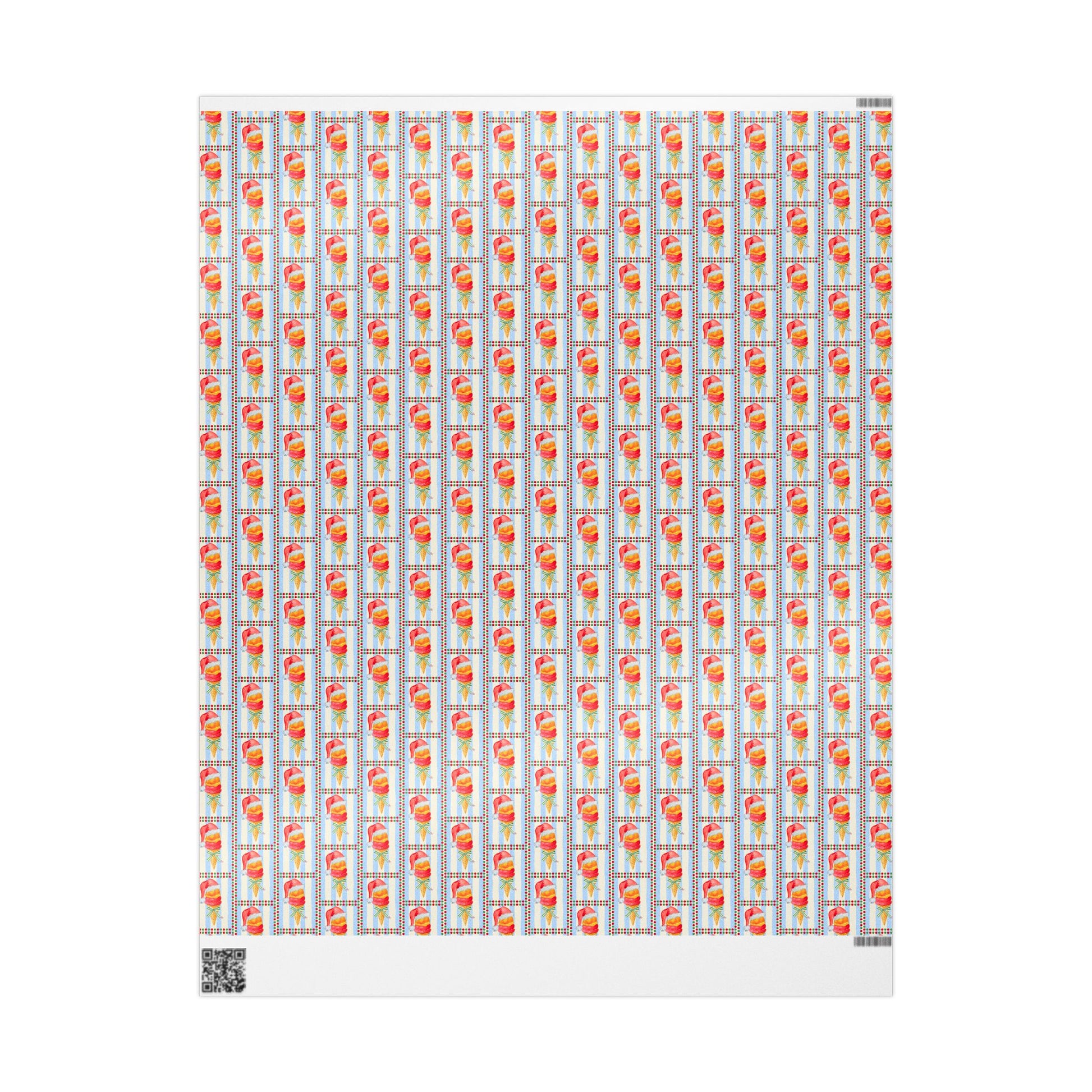 Serve up some sweet Christmas cheer! This whimsical gift wrap features a joyful pattern of a holiday-ready ice cream cone—complete with a Santa hat and a festive bow. A lively striped background and a fun border of red and green ornaments complete the look. Our custom wrapping paper is printed on high-quality 90gsm fine-art wrapping papers, available in three sizes. These wrapping papers come with a matte or glossy finish and feature a high-definition print. Paper comes neatly rolled up for an excellent delivery experience.