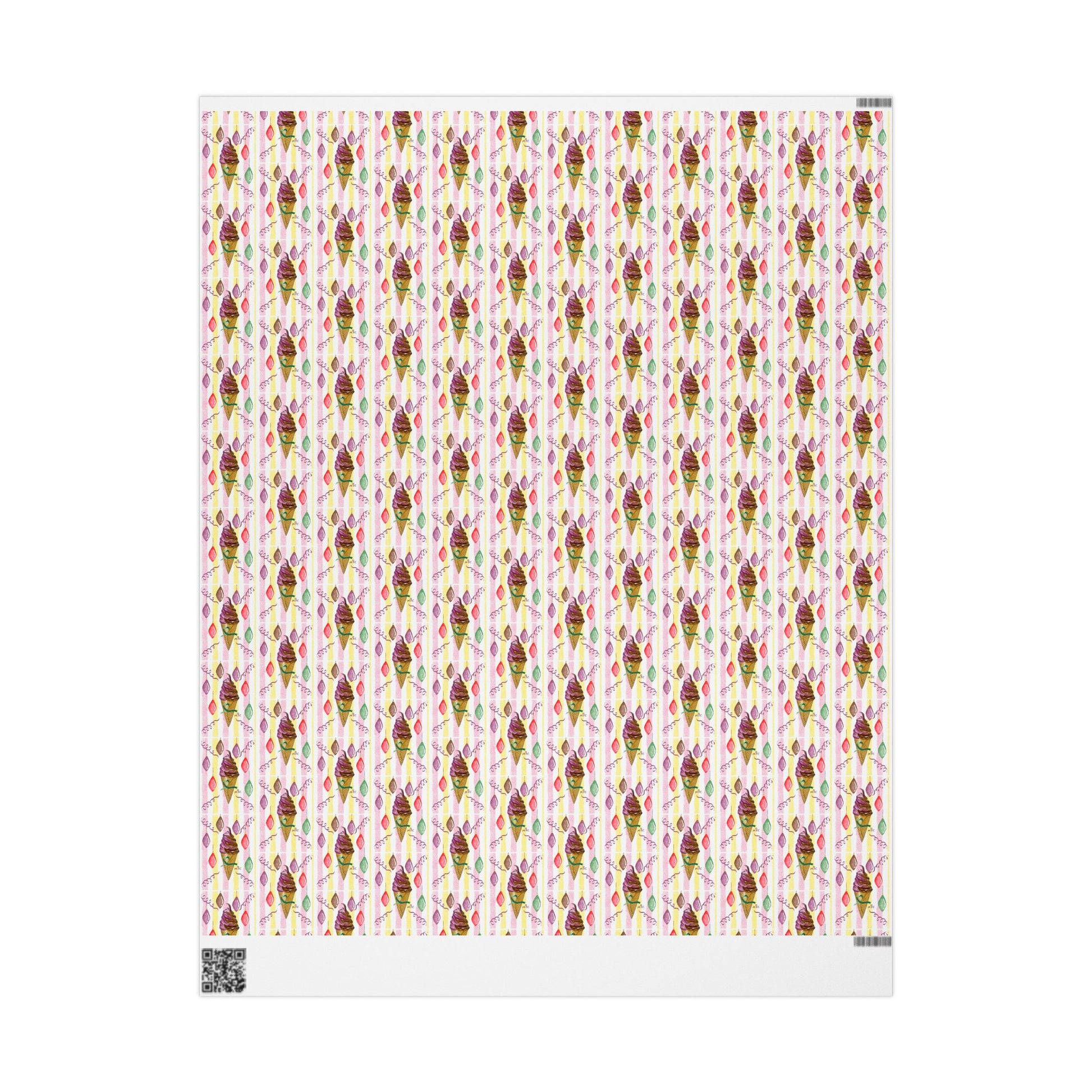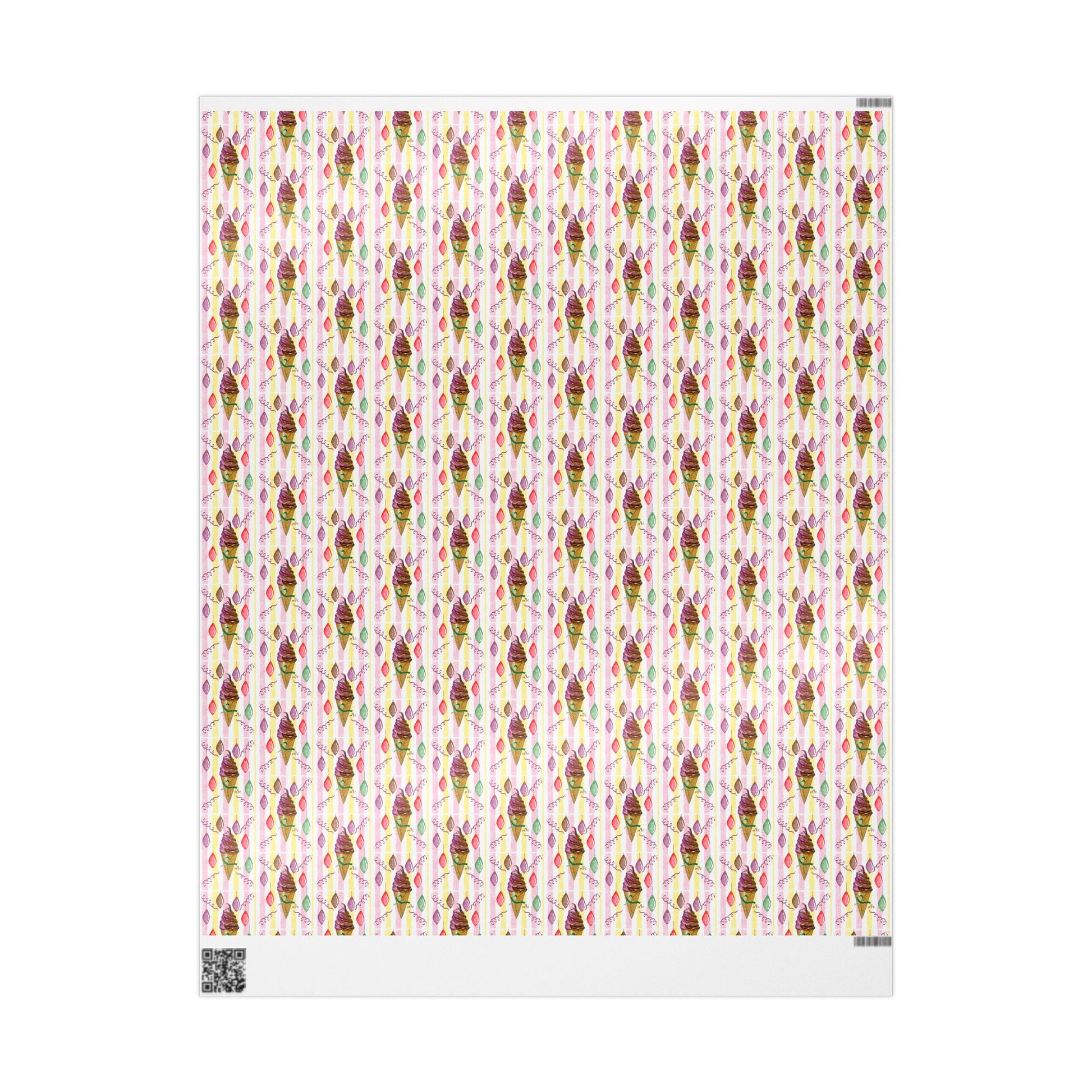 This whimsically retro Christmas wrapping paper features a colorful, two flavor-swirl ice cream cone tied with a curly ribbon. Vintage ornaments float around the festive dessert, all set against a clean, striped background. Our custom wrapping paper is printed on high-quality 90gsm fine-art wrapping papers, available in three sizes. These wrapping papers come with a matte or glossy finish and feature a high-definition print. Paper comes neatly rolled up for an excellent delivery experience.