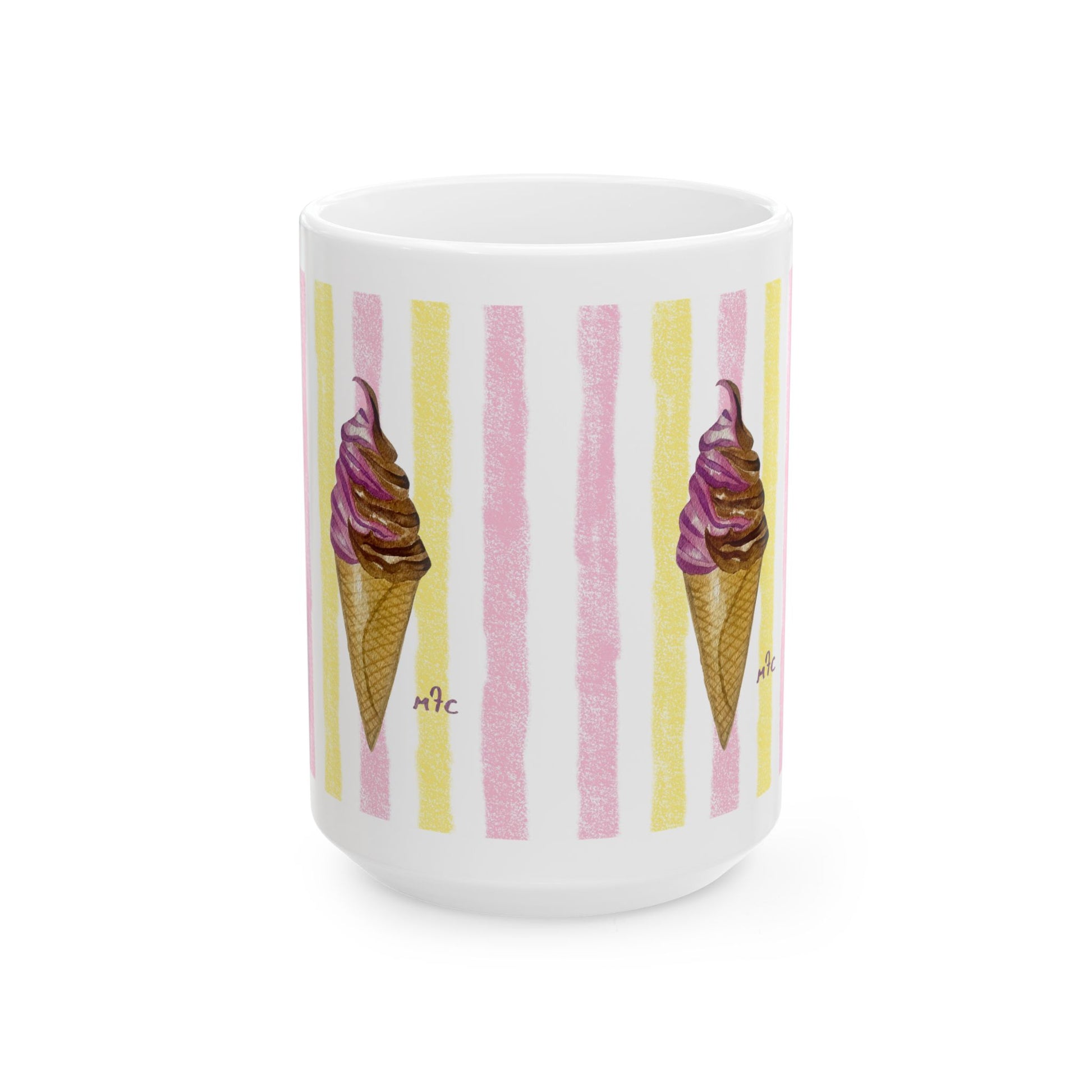 Treat the dessert lover in your life to this adorable ceramic mug. Featuring a cute swirl cone ice cream motif, it’s the perfect gift for birthdays, summer celebrations, or just to show someone you're thinking of them. It's versatile enough for coffee and tea, or you can even serve a small sundae directly in it for a special touch. It’s BPA and Lead-free, microwave & dishwasher-safe, and made of white, durable ceramic in 11-ounce and 15-ounce sizes. Thanks to the advanced printing tech, your designs come to life with incredibly vivid colors – the perfect gift for coffee, tea, and ice cream lovers.